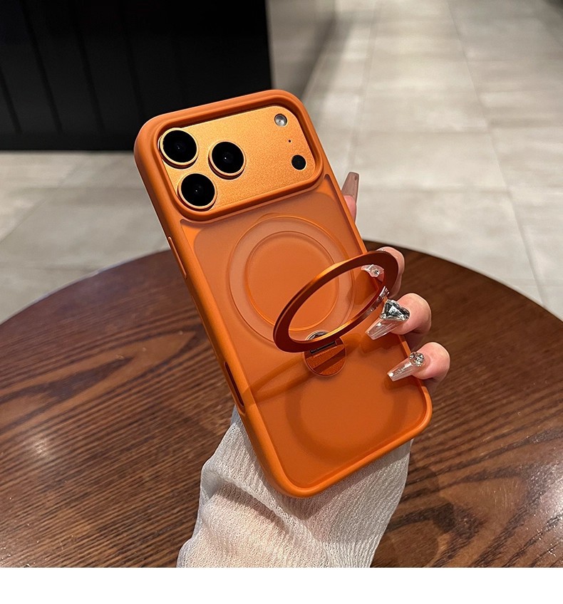 A hybrid TPU + PC iPhone case with a frosted matte back, shock-absorbing silicone edges, and a 360° rotating magnetic ring stand — built for modern living.