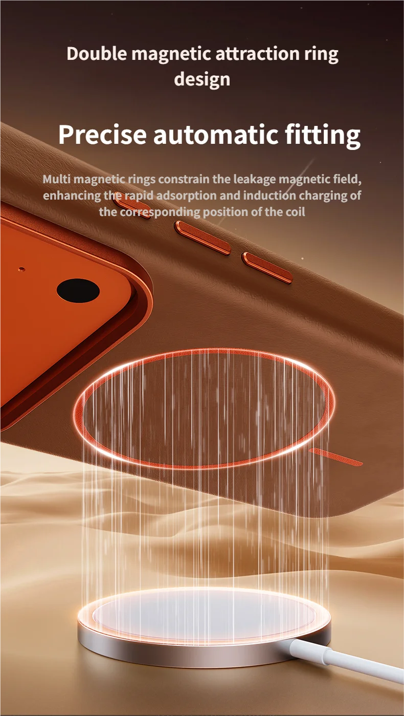 A premium PU leather case with luxiours feel texture, raised metal lens guard, and MagSafe compatibility — built for elegance and engineered for durability.